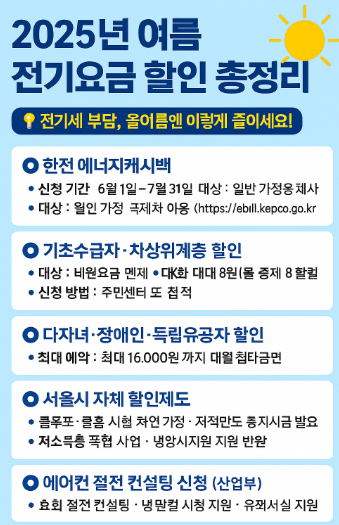 무더위가 찾아오면서 걱정되는 게 하나 있죠. 바로 전기요금입니다. 2025년 여름에도 정부와 지자체, 한전이 다양한 전기요금 할인 혜택을 제공하고 있으니 꼭 챙기세요.
