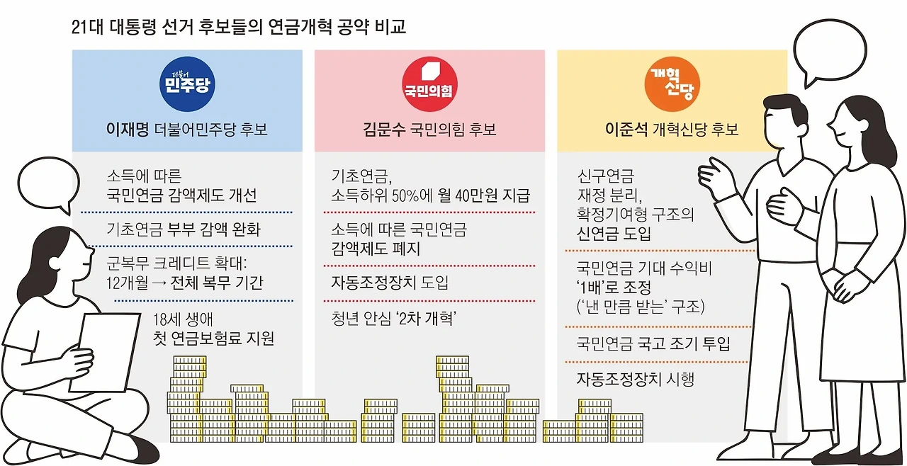 이 이미지는 21대 대선 후보들의 기초연금 개혁 공약을 비교한 것입니다. 이재명 후보는 부부 감액 폐지를 강조하고 있으며, 김문수 후보는 직접 지급을 주장하고 있습니다. 각 후보들의 입장은 기초연금 제도의 미래에 큰 영향을 미칠 것입니다.