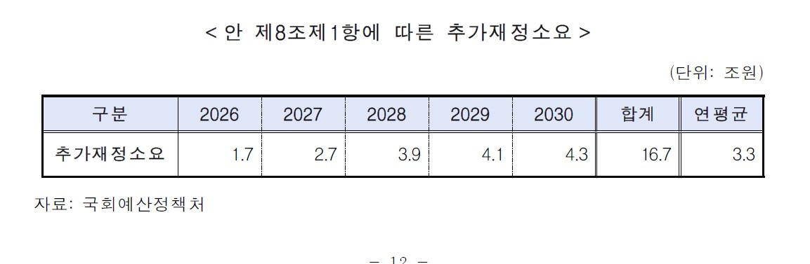 이 표는 2026년부터 2030년까지의 추가 재정 소요를 보여주고 있습니다. 5년 동안 총 16.7조 원의 재정이 필요할 것으로 예상됩니다.