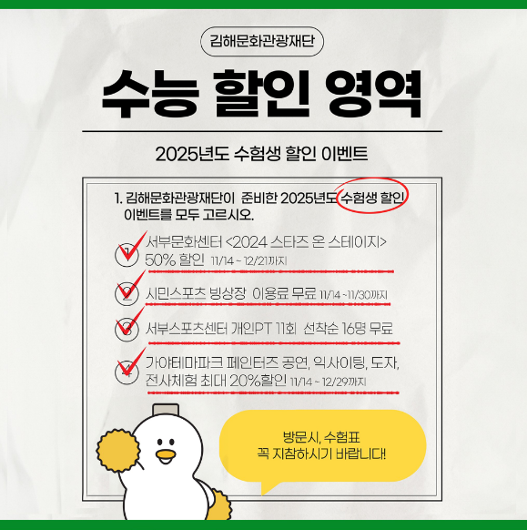 문화 행사와 관광지에서도 수험생 할인 혜택이 다양하게 제공됩니다. 예를 들어, 김해문화관광재단에서는 수험생을 위해 다양한 문화 행사와 관광지에서 50% 할인 혜택을 제공합니다. 세부적으로는 서부문화센터에서의 할인, 시립체육관 무료 이용 등이 포함됩니다. 이러한 혜택을 누리기 위해서는 반드시 학생증을 지참해야 하며, 할인 혜택은 특정 기간 동안만 유효하니 미리 확인해보시기 바랍니다.