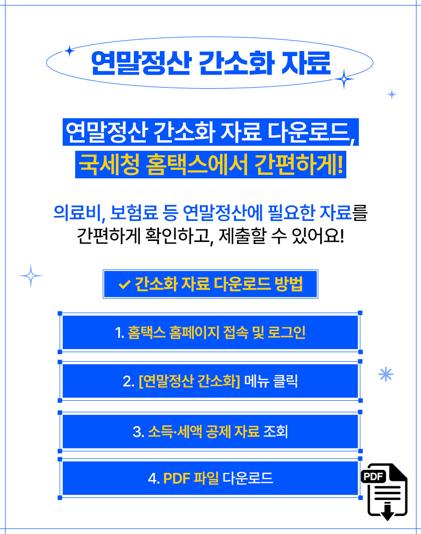 국세청에서는 연말정산 간소화 서비스를 제공하여, 근로자가 쉽게 필요한 서류를 다운로드하고 제출할 수 있도록 돕고 있습니다. 이 서비스를 통해 많은 시간을 절약할 수 있으며, 필요한 서류를 한 곳에서 쉽게 찾을 수 있습니다.