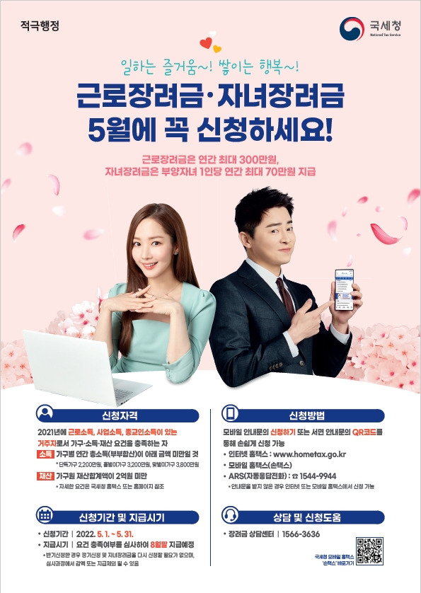 [1] 국세청 - 국세정책/제도 - 근로∙자녀장려금 - 신청기간 및 방법 (https://www.nts.go.kr/nts/cm/cntnts/cntntsView.do?cntntsId=238977&mi=40397)