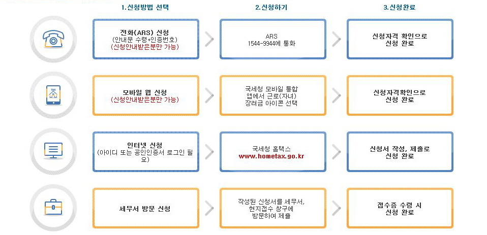 - 홈택스 : 모바일 또는 PC를 통해 신청 가능합니다. 홈택스에 접속하여 필요한 정보를 입력하면 됩니다.