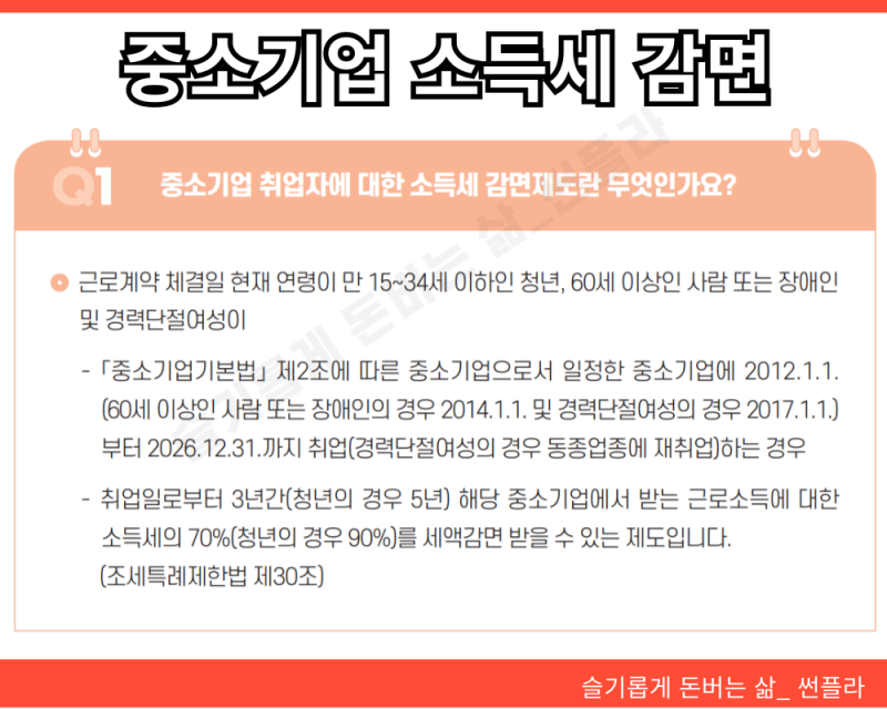 중소기업 취업자 소득세 감면에 대해 알아보겠습니다. 2025년부터 시행되는 이 제도는 중소기업에 취업한 청년, 고령자, 장애인, 경력단절 여성 등에게 소득세를 감면해 주는 정책입니다. 이 글에서는 감면의 대상, 요건, 신청 방법, 혜택 및 기간에 대해 자세히 설명드리겠습니다.