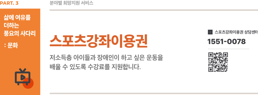 스포츠강좌이용권은 기초생활수급자와 차상위 계층의 아동 및 청소년, 그리고 장애인을 대상으로 하는 프로그램입니다. 이 프로그램은 스포츠 교육을 통해 저소득층 아동들이 다양한 스포츠 활동에 참여할 수 있도록 지원합니다. 이를 통해 아동들은 건강한 신체를 유지하고, 사회적 관계를 형성할 수 있는 기회를 얻게 됩니다.
