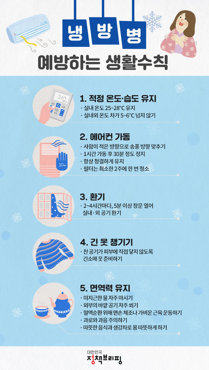 에서 볼 수 있듯이, 냉방병의 대표적인 증상들을 시각적으로 확인할 수 있습니다.
