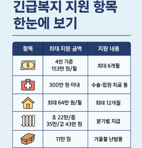 | 생계비 | 4인 기준 153만 원/월 | 최대 6개월 |